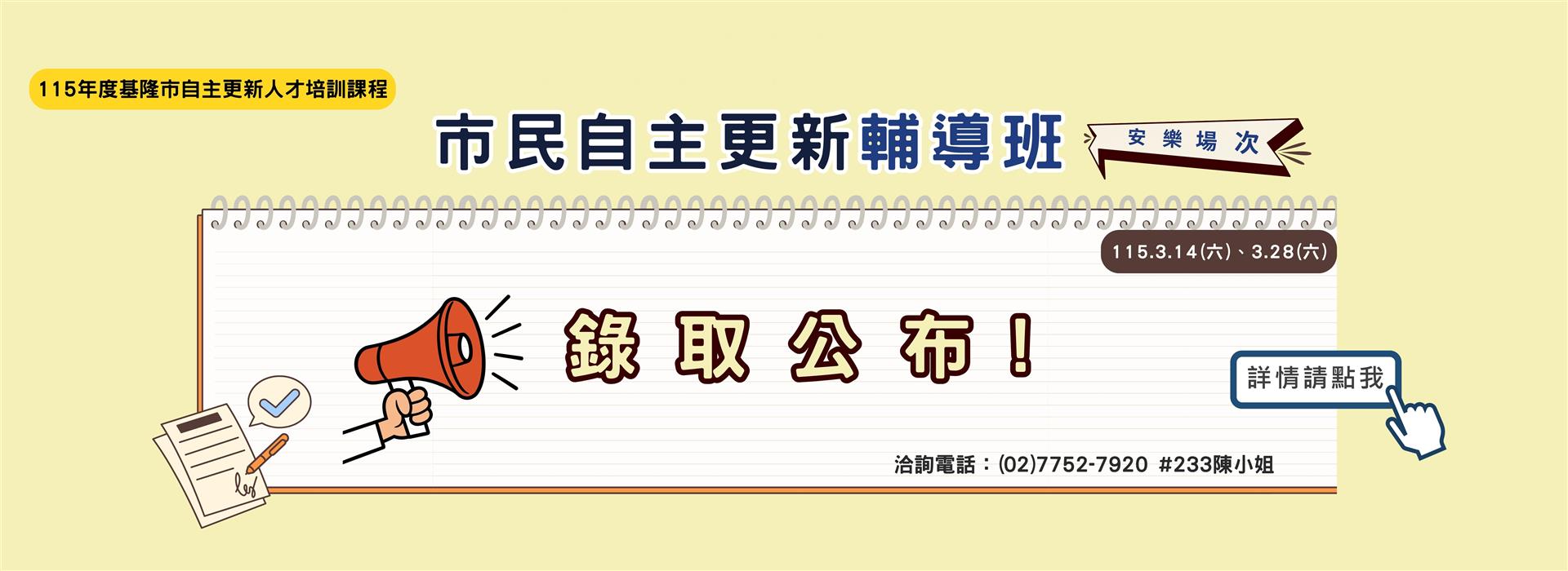 【錄取名單】115年度基隆市市民自主更新輔導班(安樂)(115/3/14、3/28)